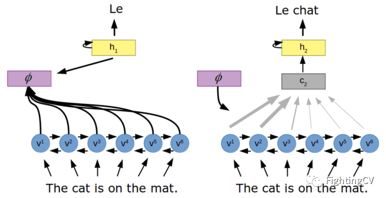 在这里,注意机制(φ)学习一组注意力权重,捕获编码向量(v)和解码器的隐藏状态(h)之间的关系,通过编码器所有隐藏状态的加权和生成上下文向量(c)。这样,解码器就可以访问整个输入序列,从而attend与生成输出最相关的输入信息。