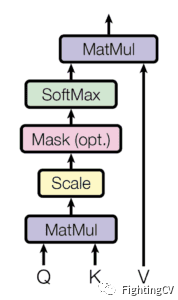 自注意机制依赖于查询、键和值的使用,这些查询、键和值是通过用不同的权重矩阵乘以编码器对同一输入序列的表示而生成的。Transformer使用点积(或乘法)注意力,在生成注意力权重的过程中,每个查询都通过点积操作与键数据库匹配。然后将这些权重乘以这些值得到最终的注意力向量。