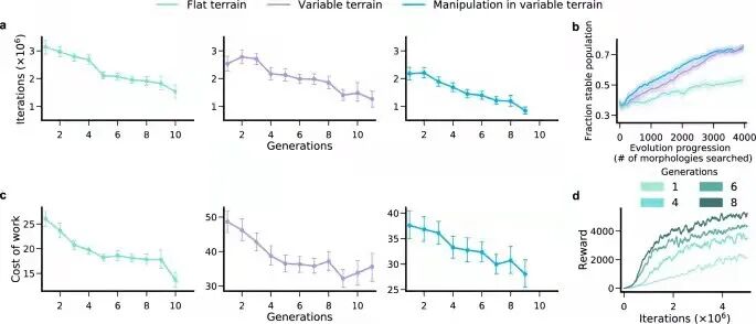 该团队在对 4000 个不同的模拟生物实验模拟后发现,存活后的 Unimal 发生了多代改变。从生存到进化的过程中,“学与做”并非同步进行,而是在平坦和崎岖的地形中边学边做。