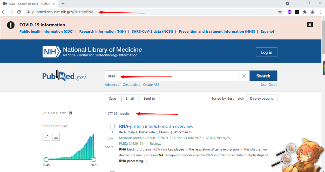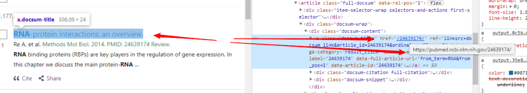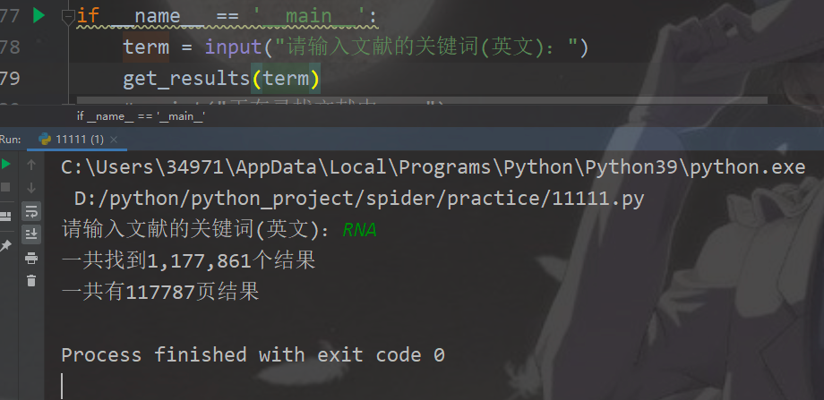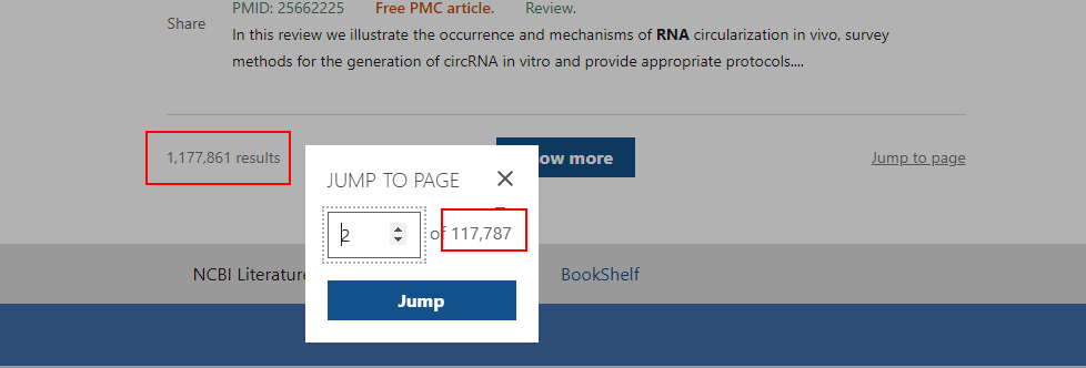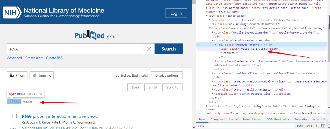 ok,第一部分的代码:获取查询到的结果,可以看到term参数的值就是我们要查询的词(图一),像以RNA为搜索词一共查到1177861个结果,我们把这个部分爬下来(图二),方便得知一共有多少的结果。而页码数(图三),我们可知一页有10个结果,页码数就是结果数除以10,多出来的结果不够10个则自成一页。
