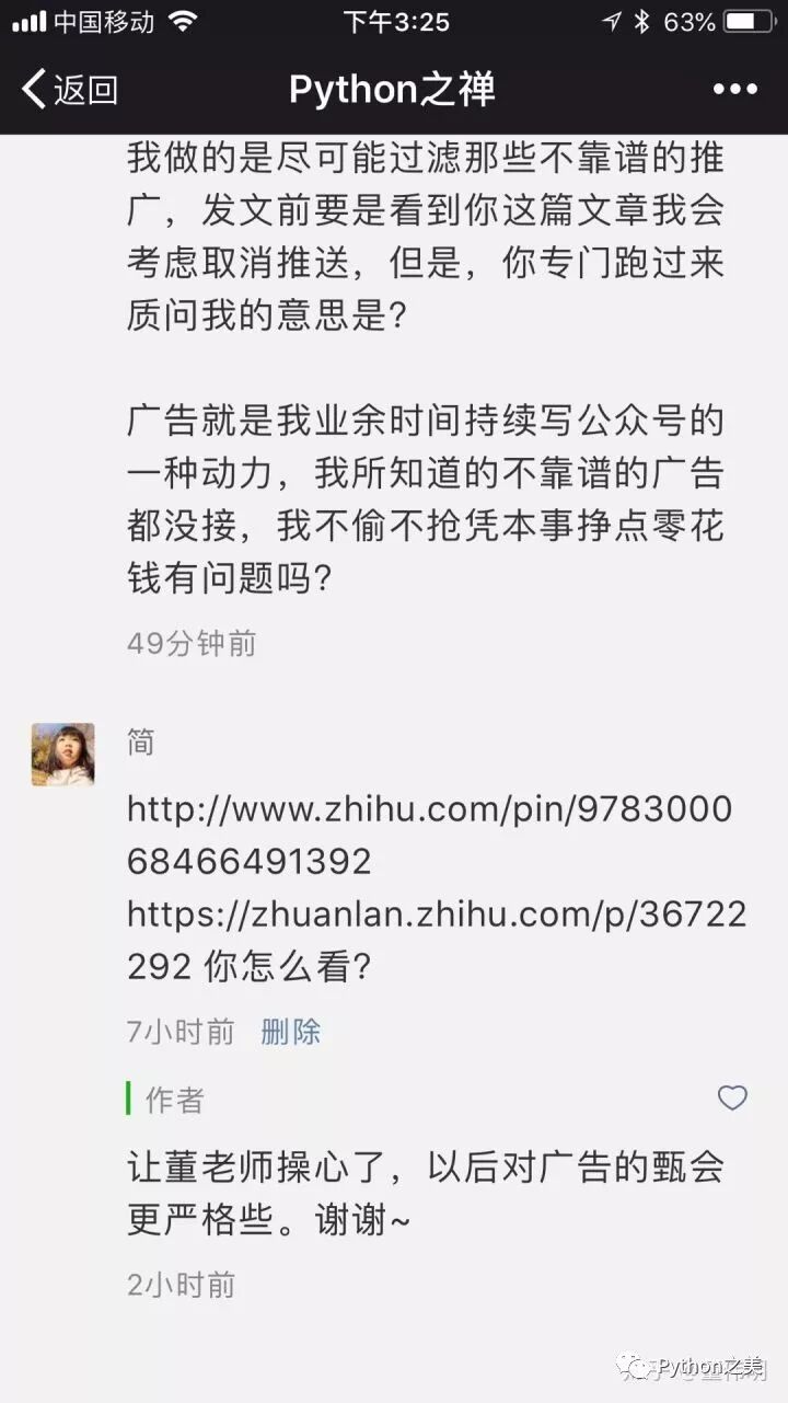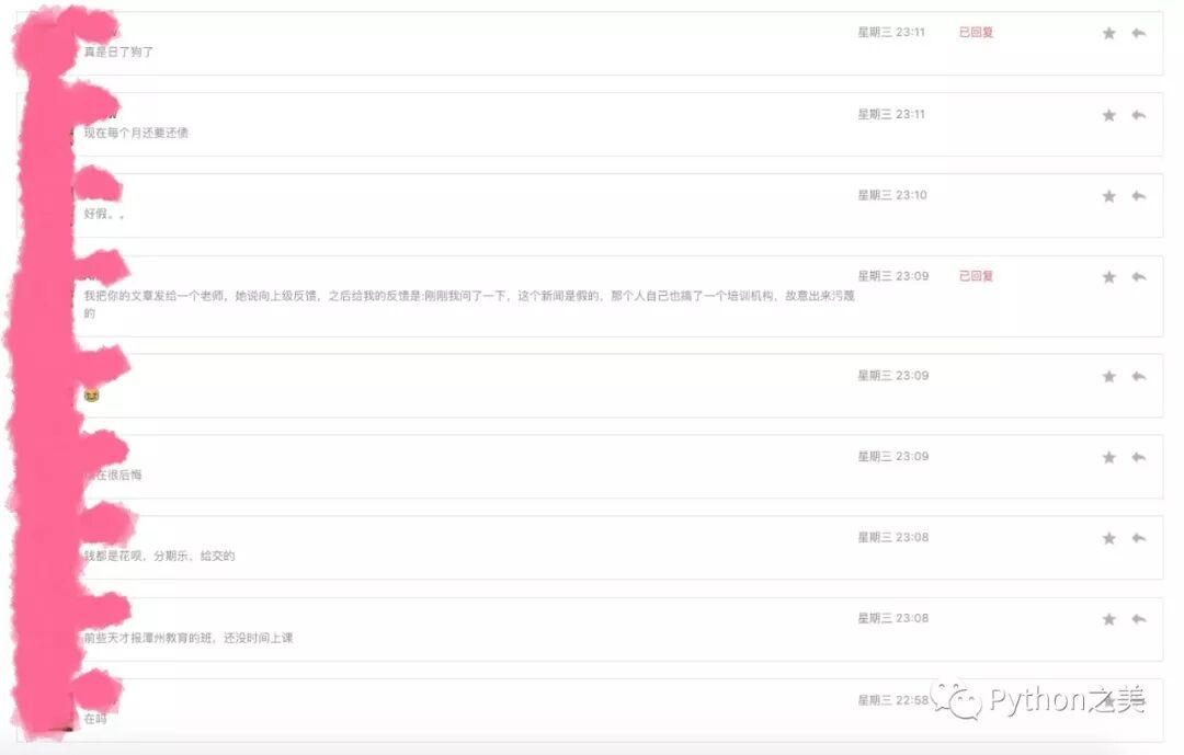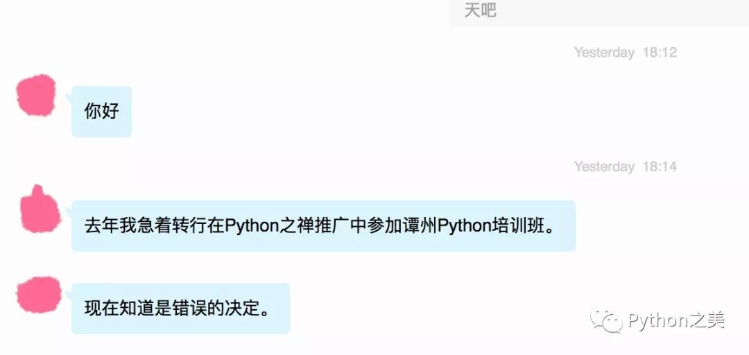 原谅我打码水平.. 这就是我写这类文章的意义,我希望大家看到的是一个正确的Python观,如之前所说做那个观点的少数派,希望未来有很多人由于看到我的文章而而不会如这2位同学一样后悔,我能做的也就到这里。和工作生活一样,勿以善小而不为,勿以恶小而为之,在成人的世界不能只看利弊,也要分对错。某学院说我诽谤,你们别笑就好,但是提到了我搞培训,我这里墨迹几句,你们关注我就知道我在去年写过(公众号历史上我还怼过另外一个公众号,为了防止有人说我翻旧账就都不加链接了):