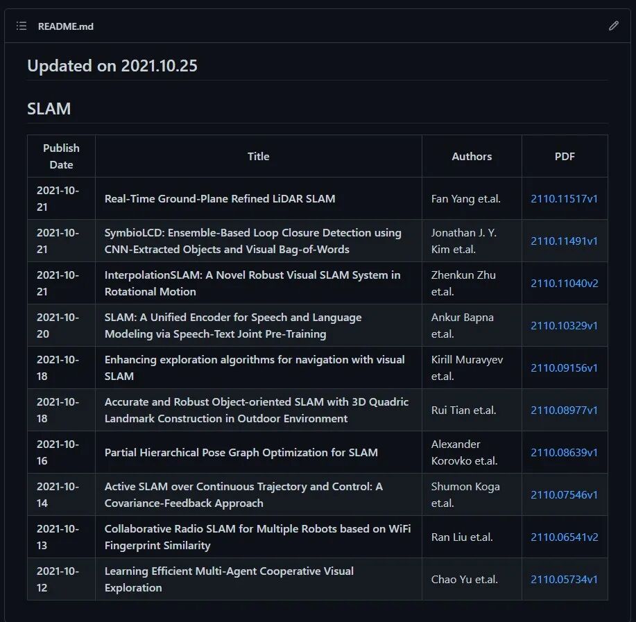 http://arxiv.org/abs/2110.11040v1 -> InterpolationSLAM: A Novel Robust Visual SLAM System in Rotational Motion http://arxiv.org/abs/2110.10329v1 -> SLAM: A Unified Encoder for Speech and Language Modeling via Speech-Text Joint Pre-Training http://arxiv.org/abs/2110.09156v1 -> Enhancing exploration algorithms for navigation with visual SLAM http://arxiv.org/abs/2110.08977v1 -> Accurate and Robust Object-oriented SLAM with 3D Quadric Landmark Construction in Outdoor Environment http://arxiv.org/abs/2110.08639v1 -> Partial Hierarchical Pose Graph Optimization for SLAM http://arxiv.org/abs/2110.07546v1 -> Active SLAM over Continuous Trajectory and Control: A Covariance-Feedback Approach http://arxiv.org/abs/2110.06541v2 -> Collaborative Radio SLAM for Multiple Robots based on WiFi Fingerprint Similarity http://arxiv.org/abs/2110.05734v1 -> Learning Efficient Multi-Agent Cooperative Visual Exploration http://arxiv.org/abs/2110.03234v1 -> Self-Supervised Depth Completion for Active Stereo http://arxiv.org/abs/2110.02593v1 -> InterpolationSLAM: A Novel Robust Visual SLAM System in Rotating Scenes