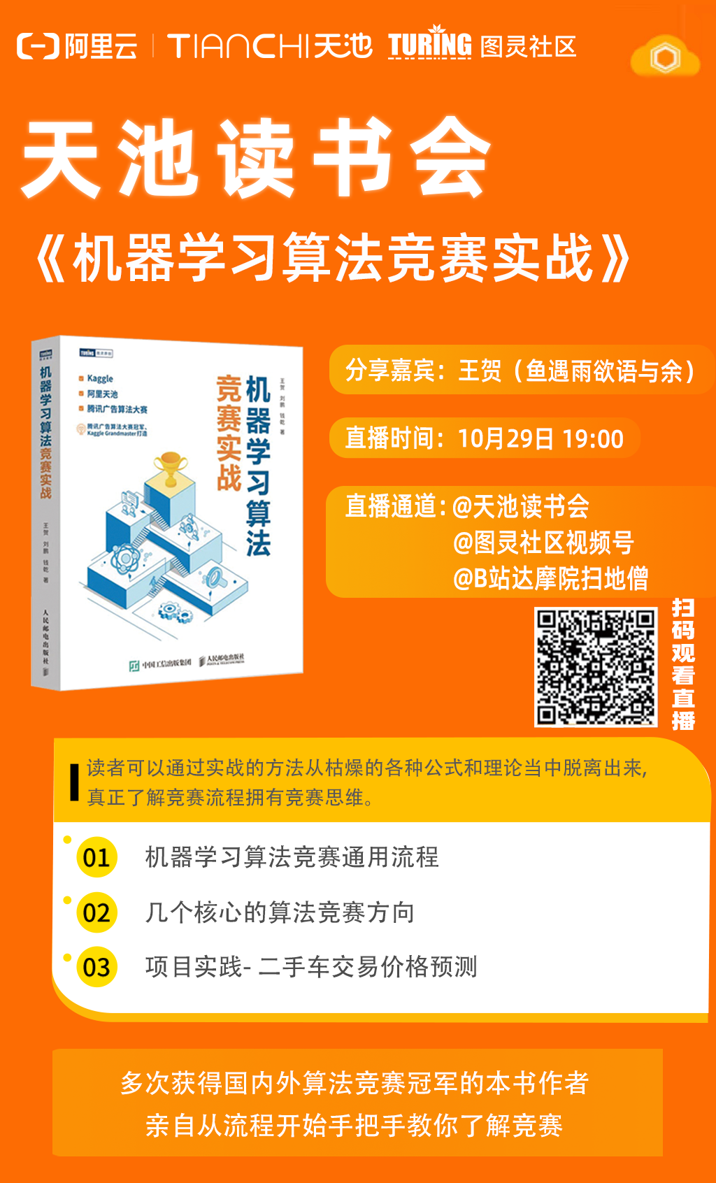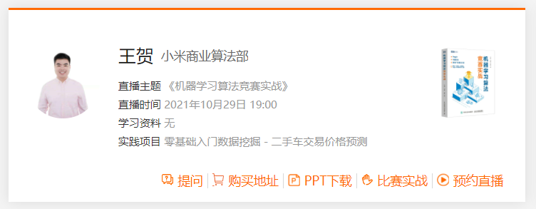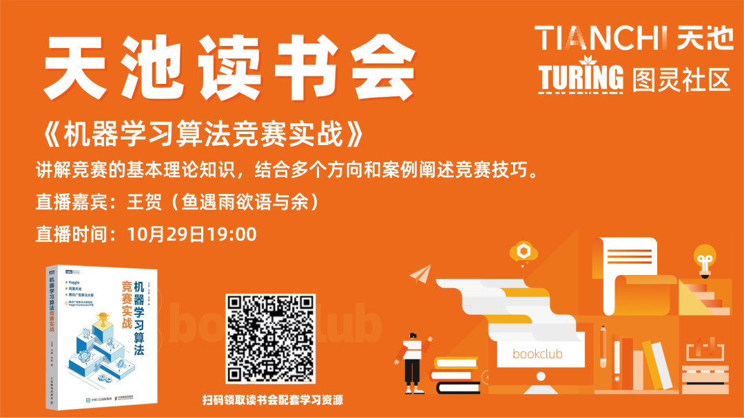 关于图书更详细的介绍,大家可以扫下方二维码或者点击阅读原文即可预约10月29日 19:00 王贺老师读书会直播,和老师一起学习《机器学习算法竞赛实战》。