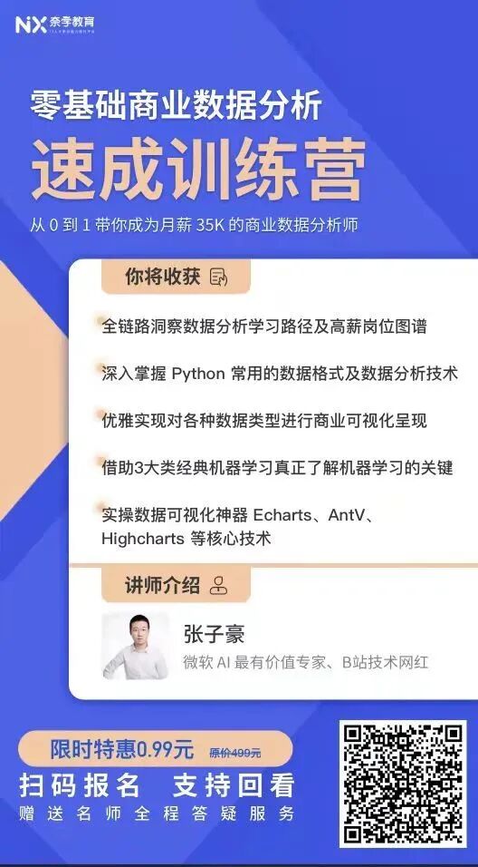 最近,我一直很喜欢的数据大神“张子豪”,他是斯坦福-硅谷华人创业成员,获得了微软2020-2021人工智能方向“最有价值专家”,更是B站科技人气UP主,每次看他的视频内容都受益匪浅。他最近在奈学教育推出了《零基础商业数据分析速成训练营》,分享多年数据分析工作经验和商业实战经历,帮助小白从0到1入门数据分析,深度剖析当下互联网企业的数据分析痛点需求,系统掌握这项重要且值钱的技能,带你掌握高薪数据分析师必备的岗位技能!