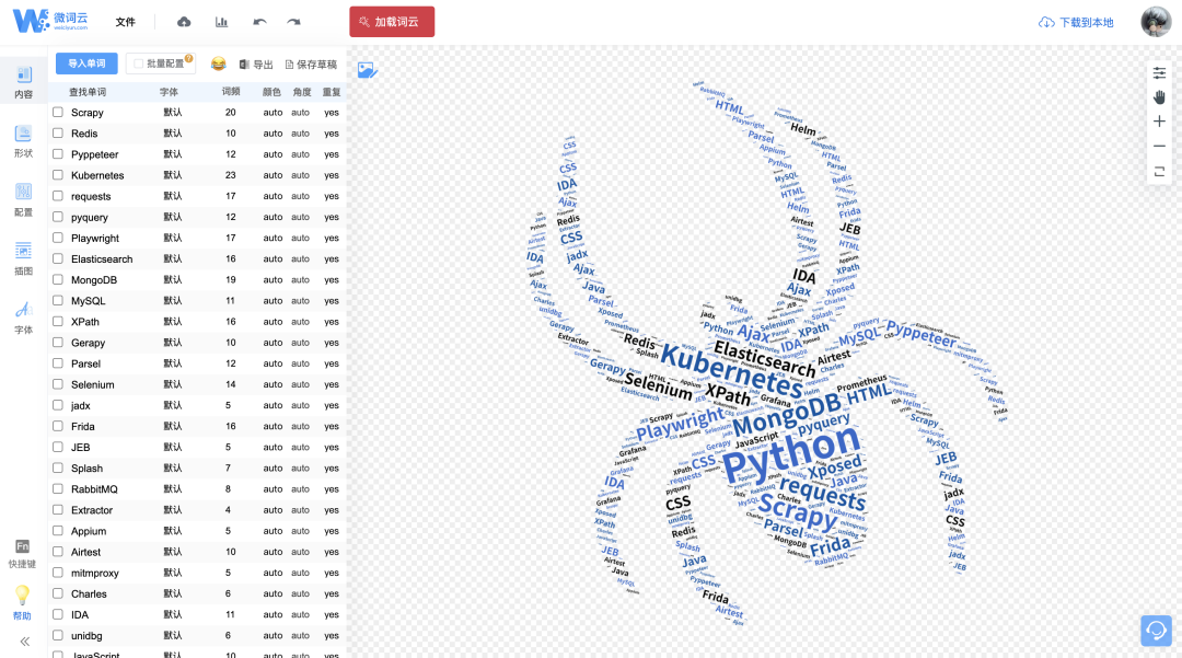 其实不用这么麻烦,我找到了一个网站,叫做微词云,这个还是比较简单好用的,我们只需要输入关键词和每个词的频率,还能自定义想要的轮廓,它就能自动生成词云图了,如图所示: