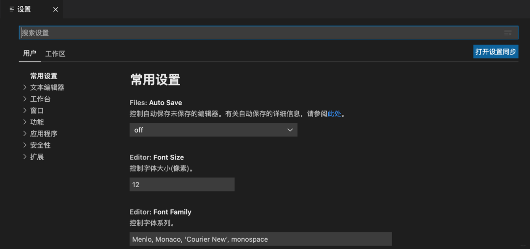 comand+,: 进入设置,这里可以进行用户和工作区的设置,像什么代码风格,字体风格各种设置都在这里 这两个快捷键建议记好。