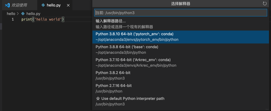但是如何建立大项目,写更加复杂的代码呢? 这里可以安装anaconda, 然后在里面建立虚拟环境,然后在vscode中指定,就可以写了。 点击左下角的Python3.8.2这里。