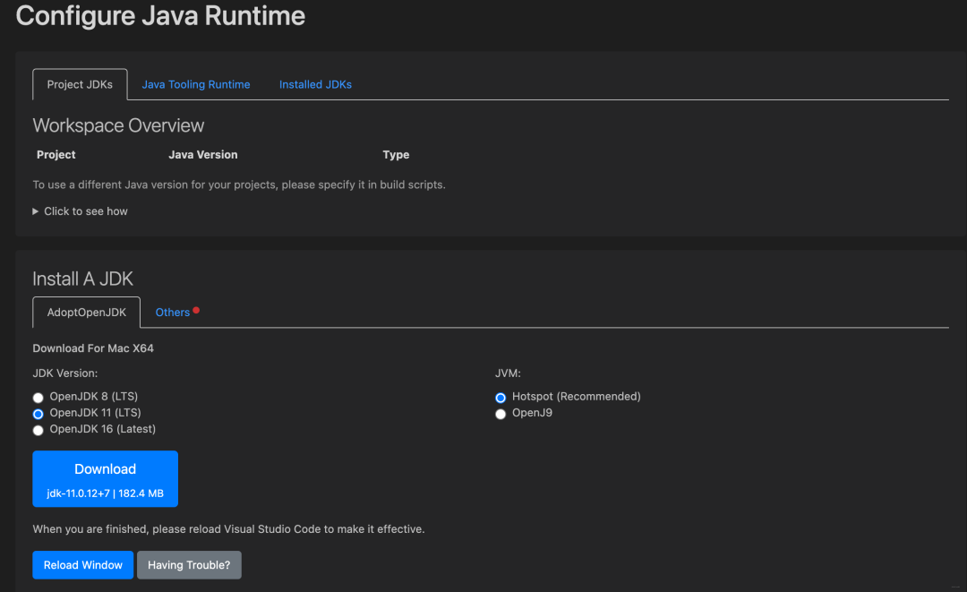 command+shift+p进入命令窗口,搜索Java Overview, 在右侧Configure那里,点击Configure Java Runtime,通过VSCode默认的「AdoptOpenJDK」下载入口,选择我们需要下载的「JDK」和「JVM」的版本