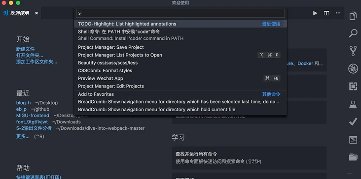 command+shift+p: 这个是打开命令交互面板, 在命令面板中可以输入命令进行搜索(中英文都可以),然后执行。命名面板中可以执行各种命令,包括编辑器自带的功能和插件提供的功能。