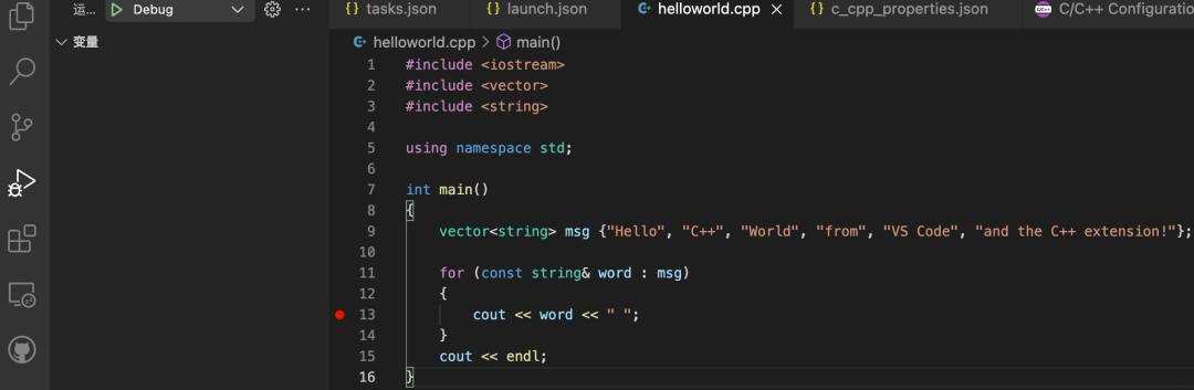 # task.json // 生成可执行文件"${fileDirname}/src/${fileBasenameNoExtension}" # launch.json "program" : "${workspaceFolder}/src/${fileBasenameNoExtension}" ,如果想debug, 就点击左边的小虫子图标, 然后打断点, 在左上角再点击绿色箭头,就进入debug模式了。 到这里为止, C++环境配置完成。
