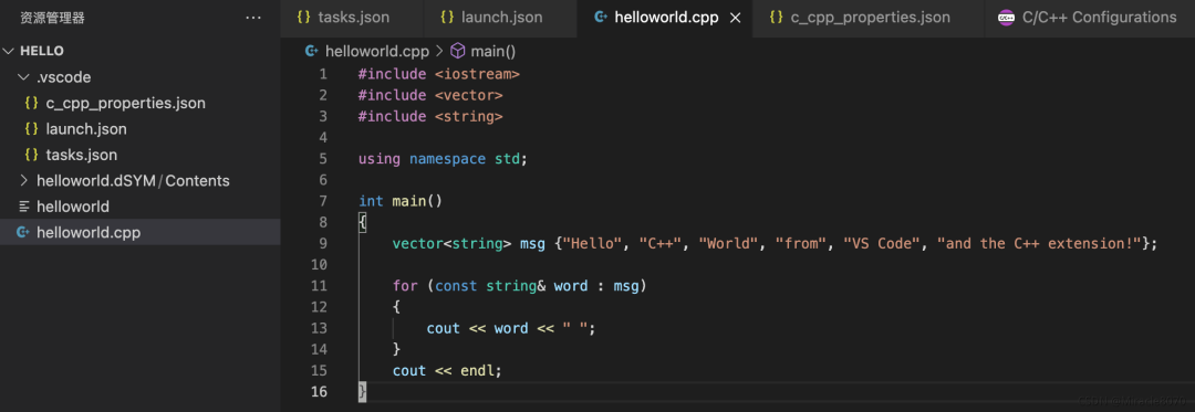 然后command+shift+b就可以进行编译,然后点击右上角的执行按钮即可运行程序了。注意,如果改变helloworld.cpp的位置,比如新建个src目录, 把这个cpp放入src目录,此时上面的task.json和launch.json相应位置需要做出改变。