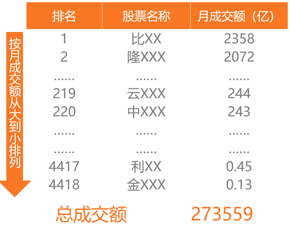 可以看到第1名的股票(比XX)当月成交额为2358亿。最后一名的成交额为0.13亿,也就是一个月才成交了1300万。