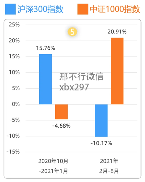 如下图所示,2020年10月到2021年1月间,大盘股涨幅明显优于小盘股。接下来的2021年2月到8月,由于抱团股的瓦解,沪深300下跌10%,中证1000反而上涨21%。