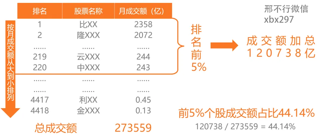同时我们可以算出排名前5%(前220名)的股票成交额加总为12万亿,以及所有4418只股票总的成交额是27万亿左右。