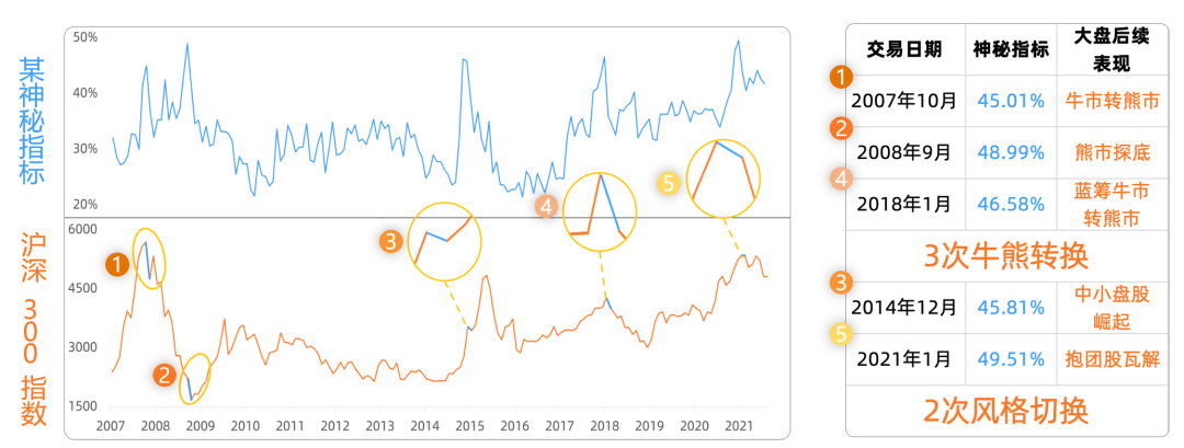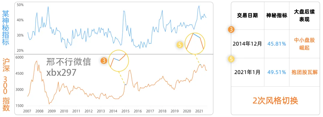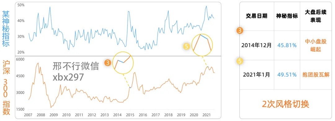 所以总的来说,点1、2、4代表了牛熊转换,点3、5代表了市场风格转换,这个指标一旦出现信号,市场确实会急剧变化。
