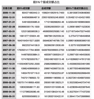 每月末把所有股票按当月成交额从高到低进行排名,加总排名前5%的股票成交额,计算其占当月全部A股成交额的比重,即为指标的值。