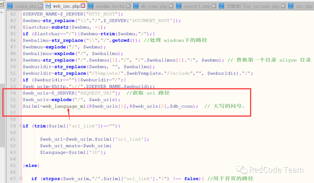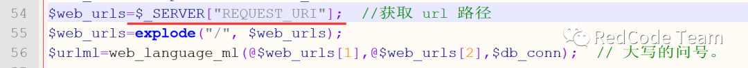 打开index.php,看到了include_once,如图定义了一些数据库配置信息,$db_conn变量为mysqli的实例,我们再来看一下contorl.php定义了一些函数信息,5-11行进行全局的GET请求过滤。了解一些东西之后回到Include/web_inc.php下继续往下翻一翻代码。调用了web_language_ml函数?我们跟进看一下。发送了一次SELECT查询的SQL语句,携带参数1参数2,我们看一看参数的来源。注入漏洞产生了,$_SERVER[REQUEST_URI]是用来获取url的(协议://域名/ 除外),如图:我们都知道,在发送GET请求时,问号后的内容会被当做参数处理,那么符合REQUEST_URI的气质,问号后的内容也被获取到了。在程序判断中通过 斜杠/ 分隔,随后直接引入程序中的SQL语句中,从而引发SQL注入漏洞。你可能会问,刚刚不是还过滤了全局GET吗?除此之外REQUEST_URI所接收的值不会被url解码而变化,比如我传入%0a(换行符)就原封不动的取出。我们举个例子与$_GET作一下比较。如图:我们都知道%20为空格,我们通常都会通过空格从注入语句中分隔语句。避免造成语法错误。而HTTP请求中GET是不允许出现未urlencode编码过的字符串的,如图:不符合HTTP协议规则,直接爆出400错误!这里可以想到Mysql中 [空格]--[空格] 的注释方式被BAN掉!!!又因为程序通过 斜杠(/) 分隔来代入SQL语句中,所以/**/这种注释语句也被BAN掉了!还有一种#注释姿势,很遗憾,HTTP请求依然不允许,如图: