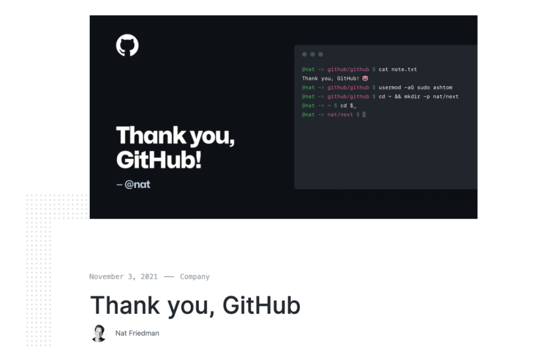今天,GitHub CEO Nat Friedman 在公司任职三年后,宣布自己即将卸任。「在 GitHub,我们的愿景是成为所有开发者的家,在过去的三年里,我有幸将 GitHub 称为家。我一生中的大部分时间都投入在开源事业上,在 GitHub ,我能够与充满激情、才华横溢的 Hubbers 团队以及我们出色的社区并肩工作。作为 GitHub 的 CEO,为这个全球开发者社区服务是我一生的荣幸。」