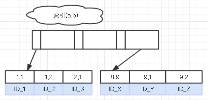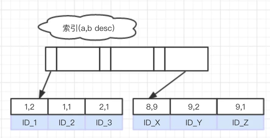 CREATE TABLE t2( id int(11) NOT NULL, a int(11) NOT NULL, b int(11) NOT NULL, c int(11) NOT NULL, PRIMARY KEY(`id`), KEY `ab` (`a`,`b` desc) ) ENGINE = InnoDB; 我们将索引 ab 的定义做了修改,在字段 b 后面加上 desc,表示对于相同的 a 值,字段 b 按照倒序存储。 这个表对应的索引 ab 的结构图如下: