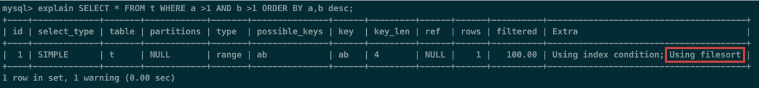 CREATE TABLE t( id int(11) NOT NULL, a int(11) NOT NULL, b int(11) NOT NULL, c int(11) NOT NULL, PRIMARY KEY(`id`), KEY `ab` (`a`,`b`) ) ENGINE = InnoDB;单字段排序