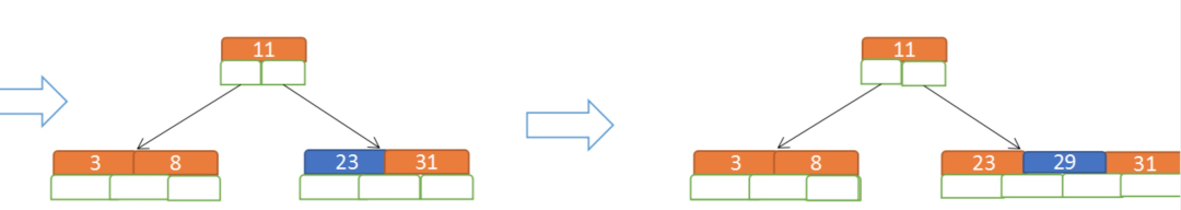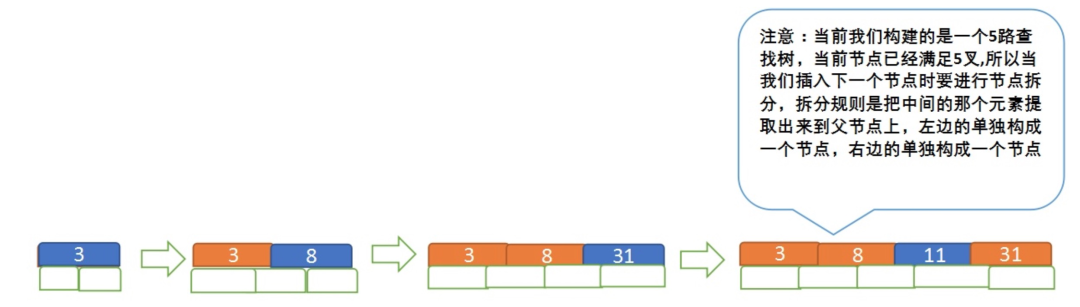 节点拆分规则:当前是要组成一个 5 路查找树,那么此时 m=5,关键字数必须 <=5-1(这里关键字数 >4 就要进行节点拆分); 排序规则:满足节点本身比左边节点大,比右边节点小的排序规则; 先插入 3、8、31、11: