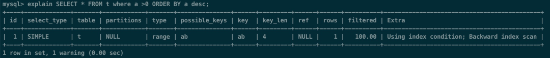 SELECT * FROM t WHERE a >0 ORDER BY a DESC;原文中没有 WHERE 子句,我额外添加上的,因为否则在我们 MySQL 版本上会导致不使用索引,最终导致使用 file sort。