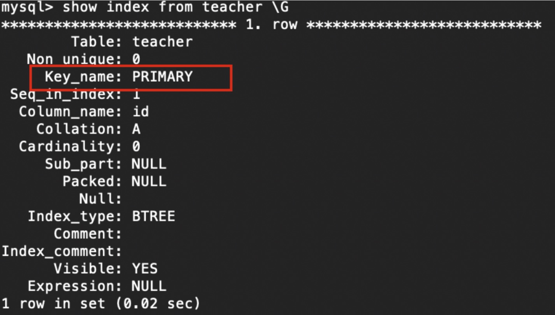 alter table teacher add primary key (id);在 InnoDB 中根据主键索引来查询是最快的,因为其他索引都是辅助索引,它们的 data 实际上为主键号,换句话说,除了主键索引,其余索引都要多走一遍 B+ 树 辅助索引是我们外加的索引,对于 InnoDB 的每一张表都能够创建至多 16 个索引,但是主键索引是唯一的,其他索引都是主键索引,比如唯一索引、普通索引。