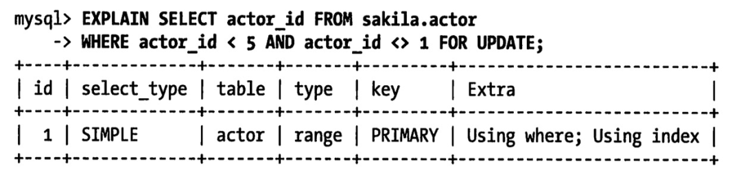 SET AUTOCOMMIT =0; BEGIN; SELECT actor_id FROM sakila.actor where actor_id AND actor_id <> 1 FOR UPDATE;FOR UPDATE 是在数据库中上锁用的,用于为数据库中的行上一个排它锁;当一个事务的操作未完成时候 ,其他事务可以读取但是不能写入或更新。