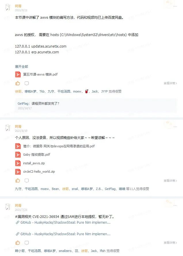 ”Python安全知识星球”第一期“Python安全攻防”于2021年05月14日全部结束了,第一期共有390+人加入,跟其它知识星球不一样,我们分享的视频都是原创的,以原创畅销书《Python安全攻防:渗透测试实战指南》为教程,辅以配套源码,工具及靶场,第一期共计58节视频课,互动评论问答268个,内部群技术交流上万条,所有教程视频和资料加起来共22.53G。