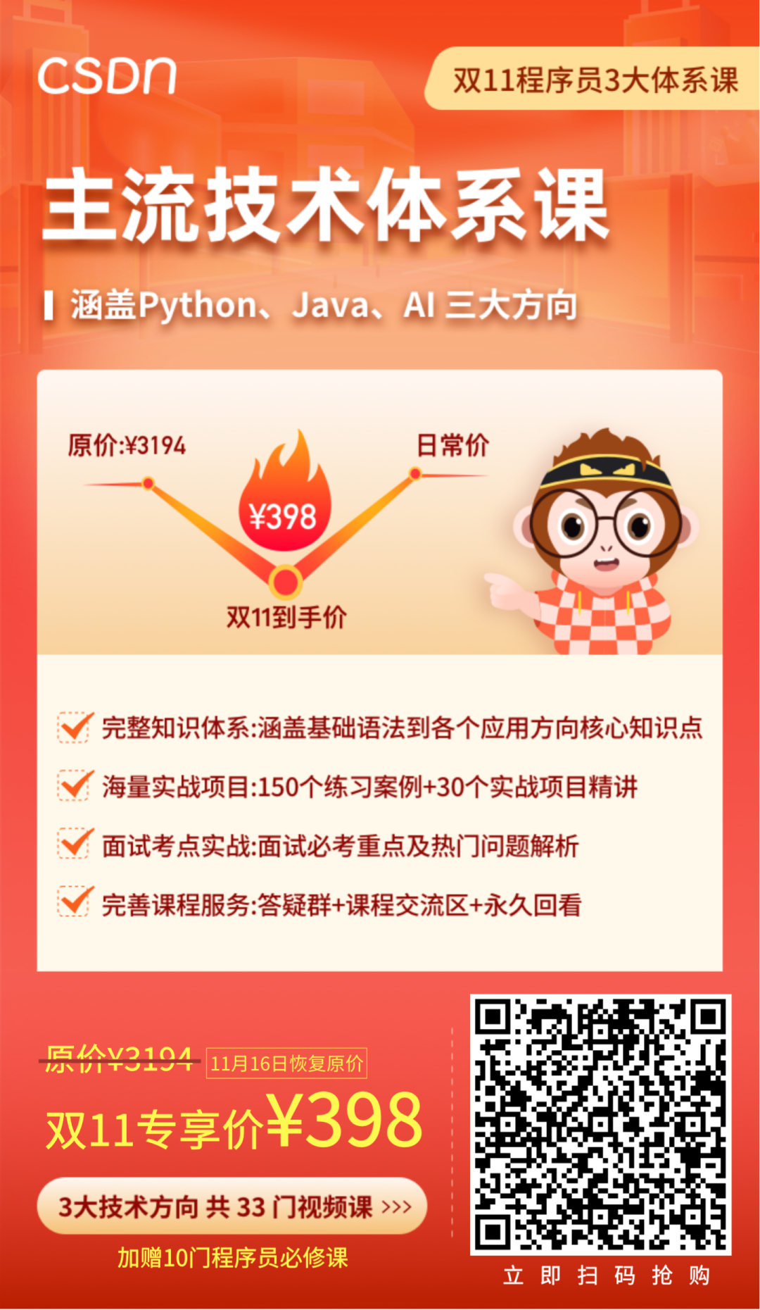 对于正在准备入门编程的同学来讲,是个一次性能学习到Python、Java、AI三大主流技术完整知识体系的好机会,无论未来从事什么技术方向,总有你需要的!