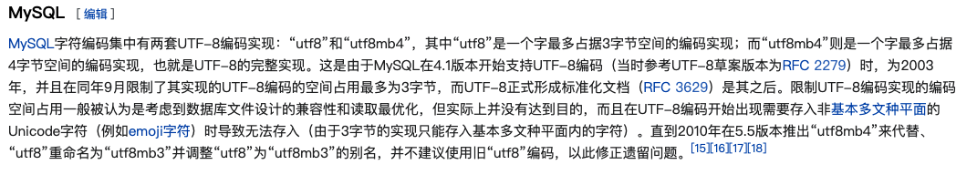MySQL 字符编码集中有两套 UTF-8 编码实现:utf8