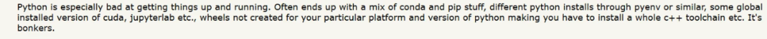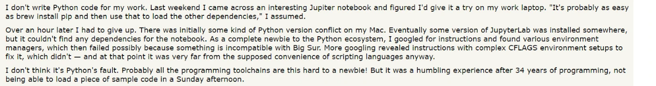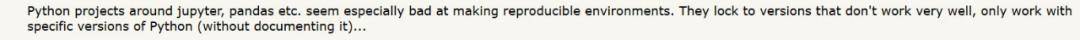 Reddit/HN 上的有些人更粗鲁:你甚至不会安装 Python 或某个版本,你一定是个傻瓜。有一个人告诉我,非常非常严肃:你只要学会使用 virtualenv,你所有的问题就都不存在了。好吧,谢谢,好像我没那样想过是的。