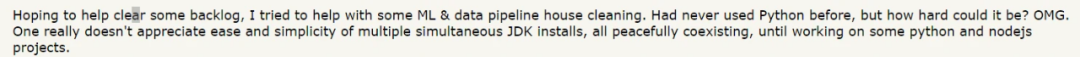 我用 Java 7 写的这些代码(当时已经有 9 年了),到现在还能正常运行。而用 Python,上周的代码今天就不能用了。 我都准备好和他决斗了。但我突然就停住了,这家伙说得很有道理。