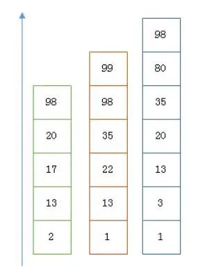 以上是三个 posting list。我们现在需要把它们用 AND 的关系合并,得出 posting list 的交集。首先选择最短的 posting list,逐个在另外两个 posting list 中查找看是否存在,最后得到交集的结果。遍历的过程可以跳过一些元素,比如我们遍历到绿色的 13 的时候,就可以跳过蓝色的 3 了,因为 3 比 13 要小。