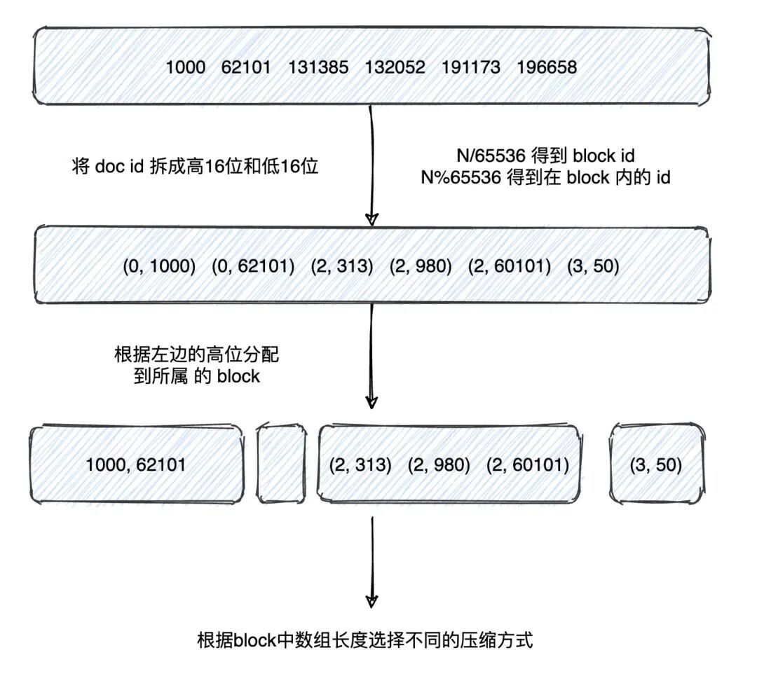 将 doc id 拆成高 16 位,低 16 位。对高位进行聚合 (以高位做 key,value 为有相同高位的所有低位数组),根据低位的数据量 (不同高位聚合出的低位数组长度不相同),使用不同的 container(数据结构) 存储。