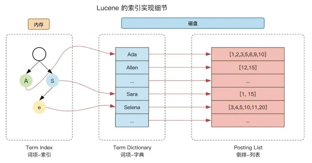 - 为了能够在数量巨大的 terms 中快速定位到某一个 term,同时节约对内存的使用和减少磁盘 io 的读取,lucene 使用 "term index -> term dictionary -> postings list" 的倒排索引结构,通过 FST 压缩放入内存,进一步提高搜索效率。
