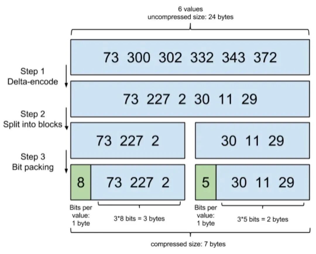 在 lucene 中,要求 postings lists 都要是有序的整形数组。这样就带来了一个很好的好处,可以通过 增量编码(delta-encode)这种方式进行压缩。比如现在有 id 列表 [73, 300, 302, 332, 343, 372]