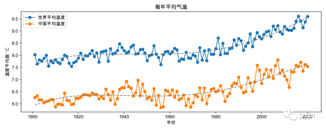 ax.set_title("每年平均气温") ax.legend() ax.set_xlabel("年份") ax.set_ylabel("温度平均数$ ^\circ C $") plt.tight_layout() fig.savefig("结果/每年平均气温.png")