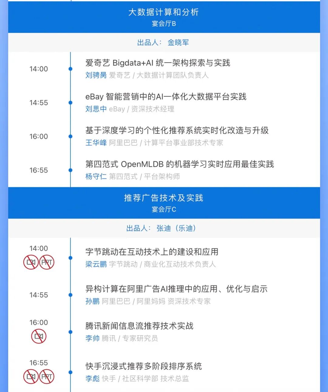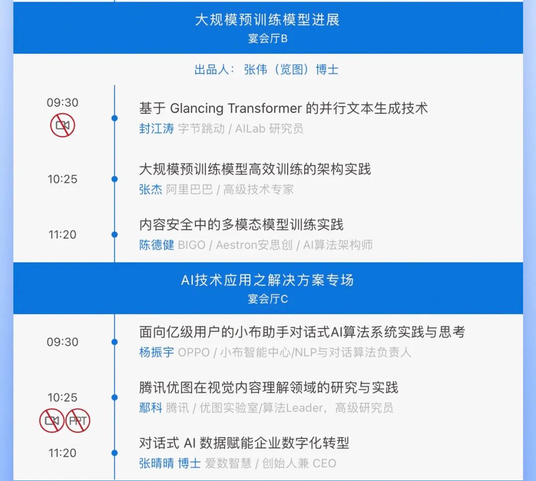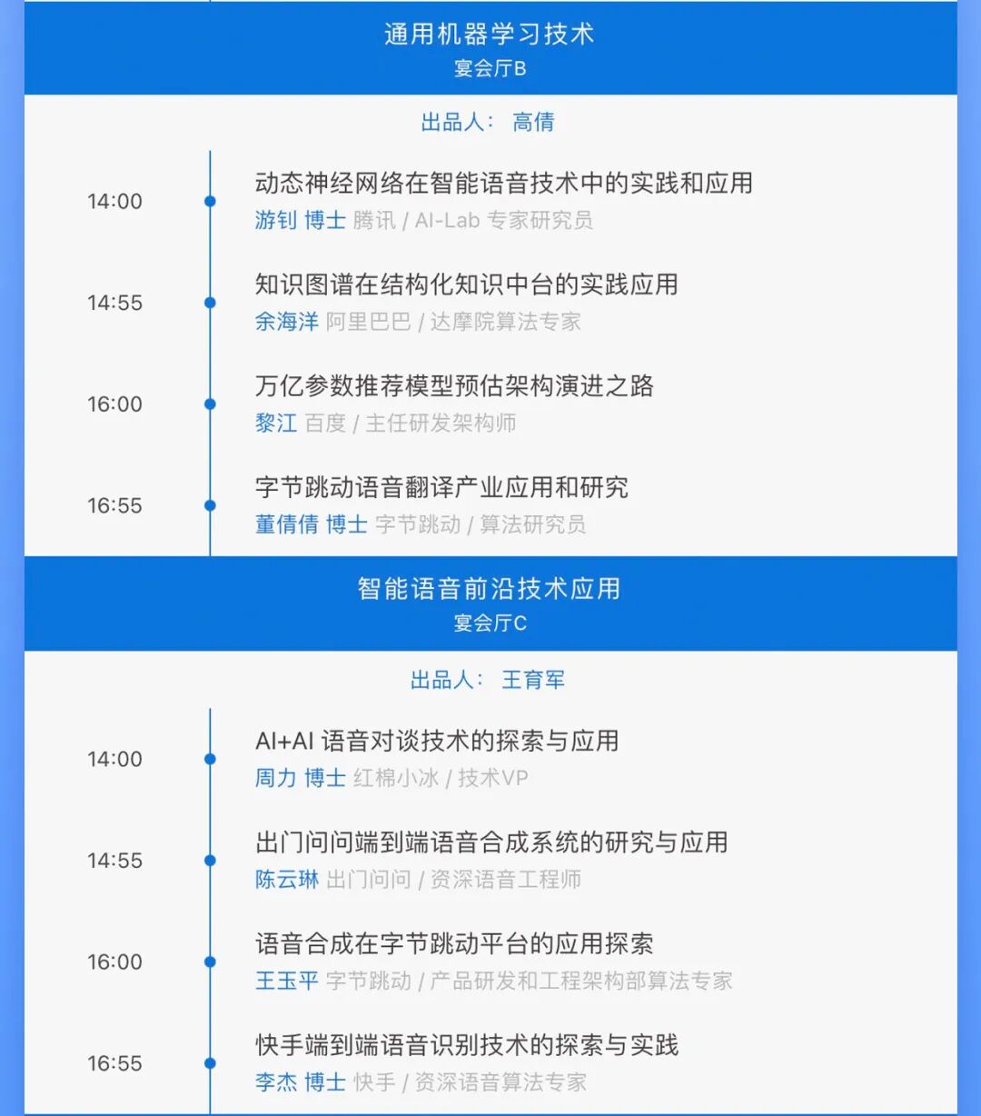 本届大会会期 2 天,邀请到 13+ 位专题出品人共同把控大会的内容。AICon 北京站设置了包括“人工智能前沿技术”、“通用机器学习技术”、“计算机视觉实践”、“智能金融技术与业务结合”、“NLP 技术与应用”、“推荐广告技术及实践”、“认知智能的前沿探索”等在内的 14 个技术专题。55+ 位演讲嘉宾均来自阿里巴巴、腾讯、百度、字节、美团等一线大厂,他们将在现场分享最新 AI 技术创新和应用实践,为大家带来一场 AI 之旅。