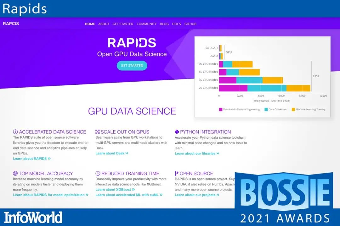 Nvidia 的 Rapids 开源软件库和 API 套件让你有能力完全在 GPU 上执行端到端的数据科学和分析管道。Rapids 使用 Nvidia CUDA 基元进行底层计算优化,并通过用户友好的 Python 接口暴露了 GPU 的并行性和高带宽内存速度。Rapids 依赖于 Apache Arrow 柱状内存格式,包括 cuDF,一个类似 Pandas 的 DataFrame 库;cuML,一个机器学习库集合,提供 Scikit-learn 中大多数算法的 GPU 版本;以及 cuGraph,一个类似 NetworkX 的加速图分析库