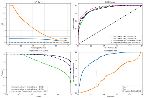 显然,lift(提升指数)越大,模型的运行效果越好。如果这个模型的预测能力跟 baseline model 一样,那么 d/b+d 就等于 c+d/a+b+c+d(lift 等于 1),这个模型就没有任何 “提升” 了(套一句金融市场的话,它的业绩没有跑过市场)。
