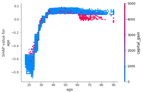 shap_values = explainer.shap_values(df) shap.dependence_plot('age' , shap_values[1 ], df, interaction_index="capital_gain" )