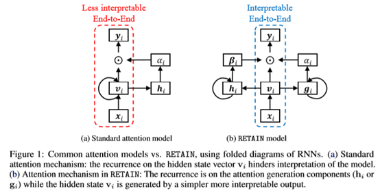 论文使用称为RETAIN的建模策略解决了这个限制,这是一种两级神经网络顺序数据的注意模型,提供对预测结果的详细解释保持与RNN相当的预测精度。为此,RETAIN依赖于关注机制被建模以表示在遭遇期间医生的行为。一个区别RETAIN的功能(参见图1)是利用注意力生成来利用序列信息机制,同时学习可解释的表示。并模仿医生的行为,RETAIN以相反的时间顺序检查患者的过去访问,从而促进更稳定的注意后代。因此,RETAIN会识别最有意义的访问次数并量化访问量有助于预测的功能。