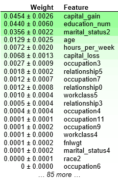 这个数据集是收入水平数据集,这个例子里,最重要的特征是“capital_gain”, 这看起来是合理的。