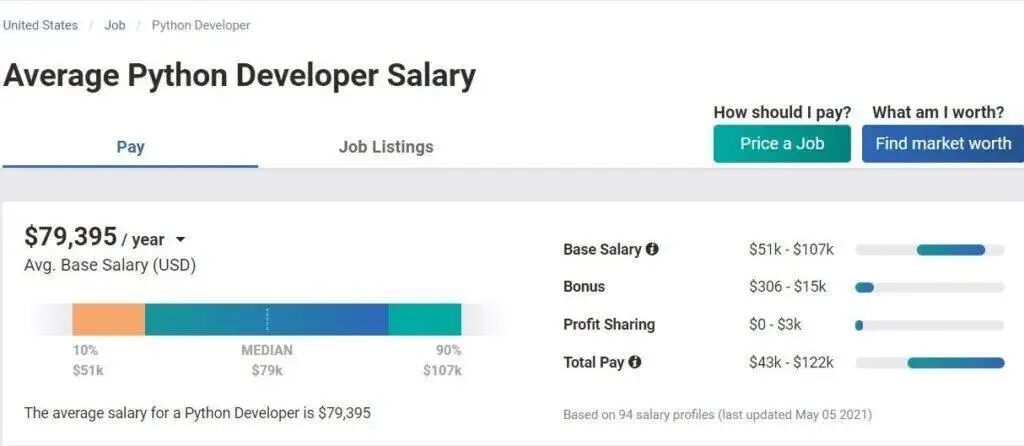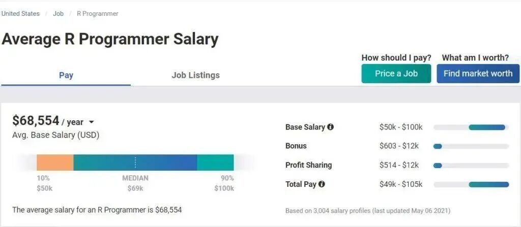根据 PayScale.com 的数据,美国 Python 开发的平均年薪为 79395 美元,而 R 程序的平均年薪为 68554 美元(截至本文发表时)。