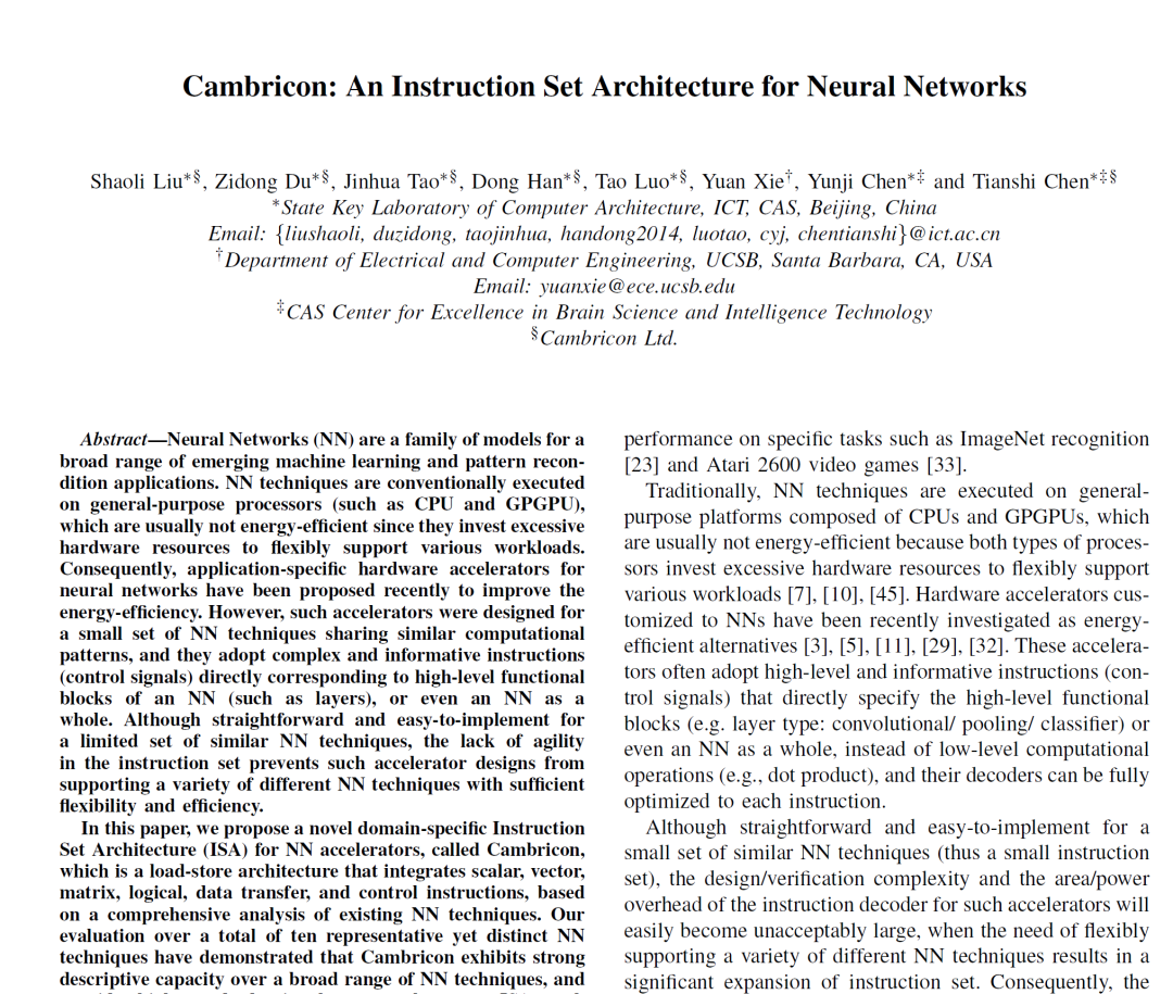 陈云霁:2014年之后,我们还是在这方面继续做了一系列工作。比如,我们开发了国际上第一个深度学习处理器的指令集 Cambricon,发表在了ISCA 2016上(获得最高分)。我们获得国家自然科学奖的成果,有很多是从那篇文章(如下)体现出来的,因为它归纳了一些最基本的计算与访存知识。
