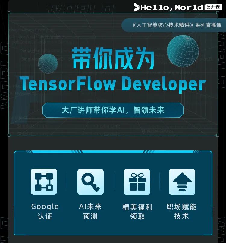 不要怕,为了帮助大家快速了解和准备Google的这个认证考试,本次特邀张春阳老师为大家带来《带你成为TensorFlow Developer》公开课,老师将从TensorFlow框架的基本原理开始讲解,让你对TensorFlow Developer不在迷茫。这次全力为大家争取到了少量优惠名额,现在免费 0 元学。