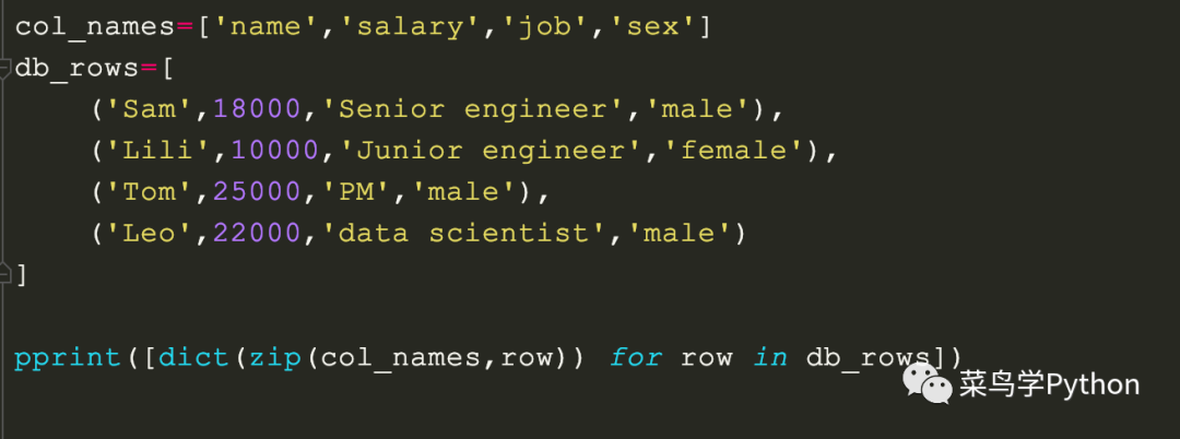 现有的数据包括全部字段的名字,以及元组的列表组织的员工的数据,现在要创建一个由字典构成的列表,这样方便转为json或者csv的表格数据。