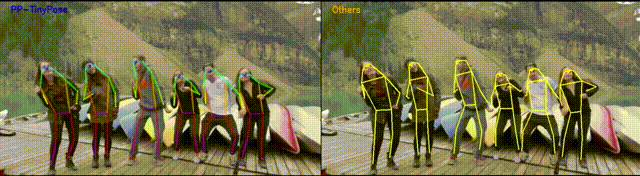更特别的是,PP-TinyPose 还能同时实现多人关键点检测,且效果超强!不仅对于检测人数无限制,其速度和精度也依旧优秀!与开源界其他类似实现相比,检测人数、精度与性能上均有明显优势,直接上图对比: