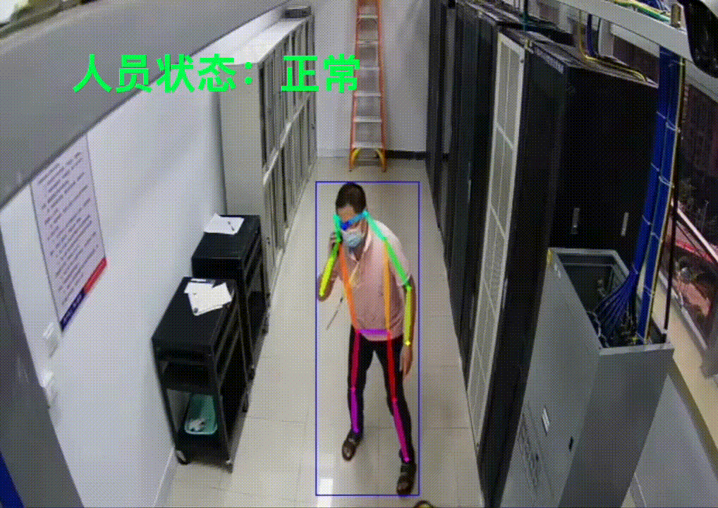 以摔倒检测为例,在上海泰思通公司的实际业务中,应用 PP-TinyPose 检测出人体关键点,结合逻辑规则进行行为分析,历时一周就实现了“实时人物摔倒识别“,部署在 Windows 服务器上的 Nvidia GeForce RTX3070,耗时仅 15ms,高效地保障了工作人员及公司资产的安全。